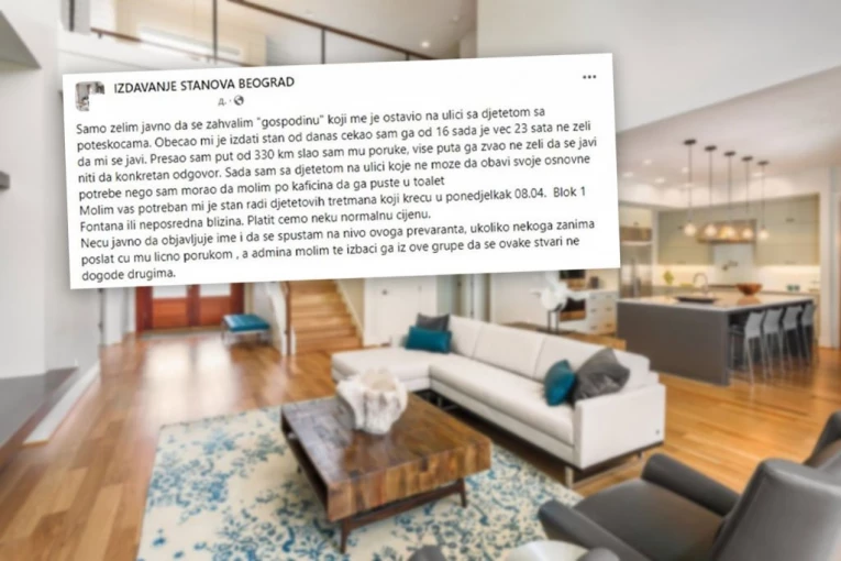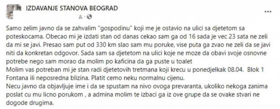 - Molim vas potreban mi je stan radi detetovih tretmana koji kreću u ponedeljak 08.04. Blok 1 Fontana ili neposredna blizina. Platićemo neku normalnu cenu - apelovao je on na korisnike društvenih mreža.