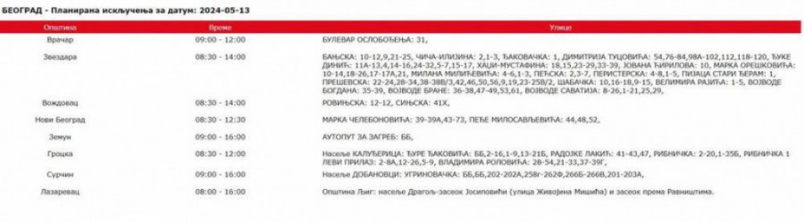 Grocka - od 08:30 do 12:00 - naselje Kaluđerica: Đure Đakovića, Radojke Lakić, Ribnička, Vladimira Popovića