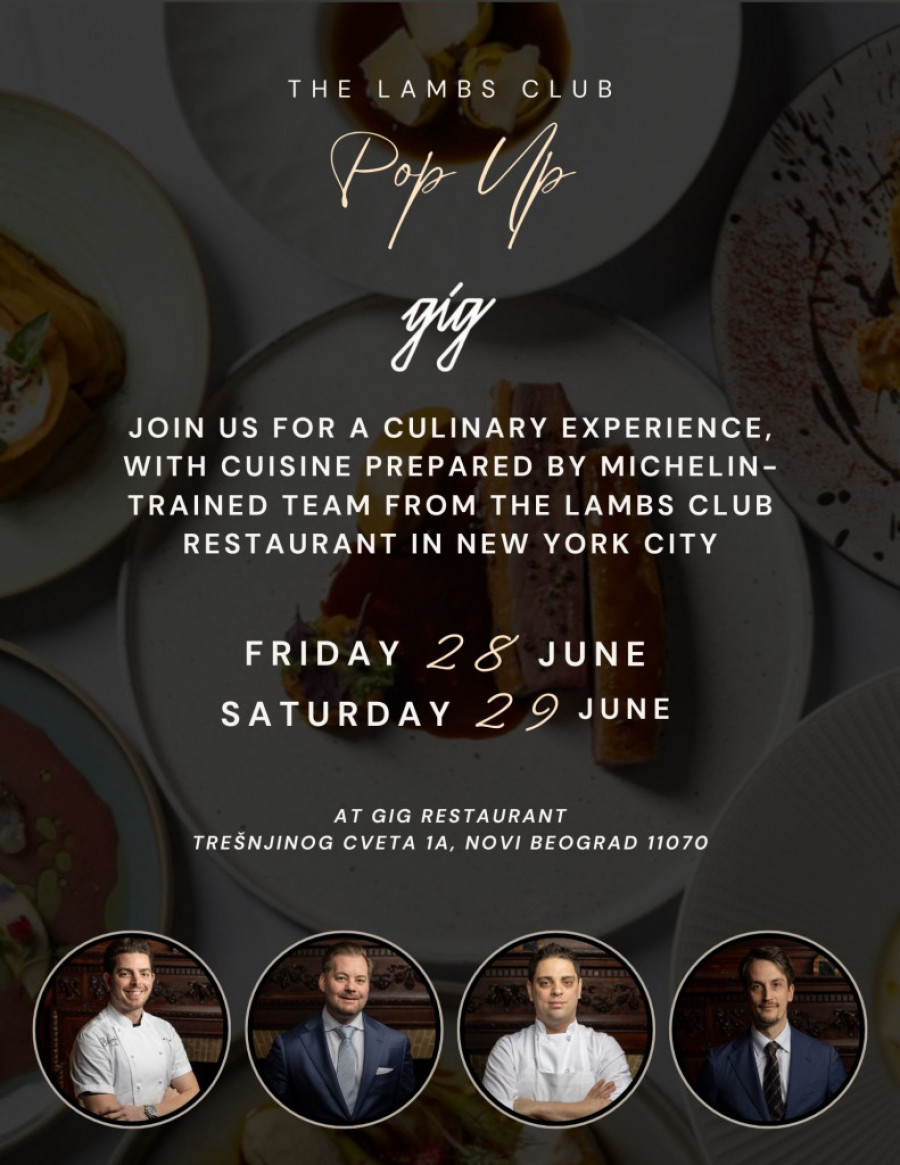 The Lambs Club, jedan od najprestižnijih restorana u New Yorku, poznat je po svojoj izuzetnoj kuhinji i inovativnom pristupu. Njihovi talentovani šefovi doneće esenciju svoje bogate ponude direktno u restoran GIG, kreirajući gastronomski spektakl koji će zadovoljiti i najistančanija nepca.