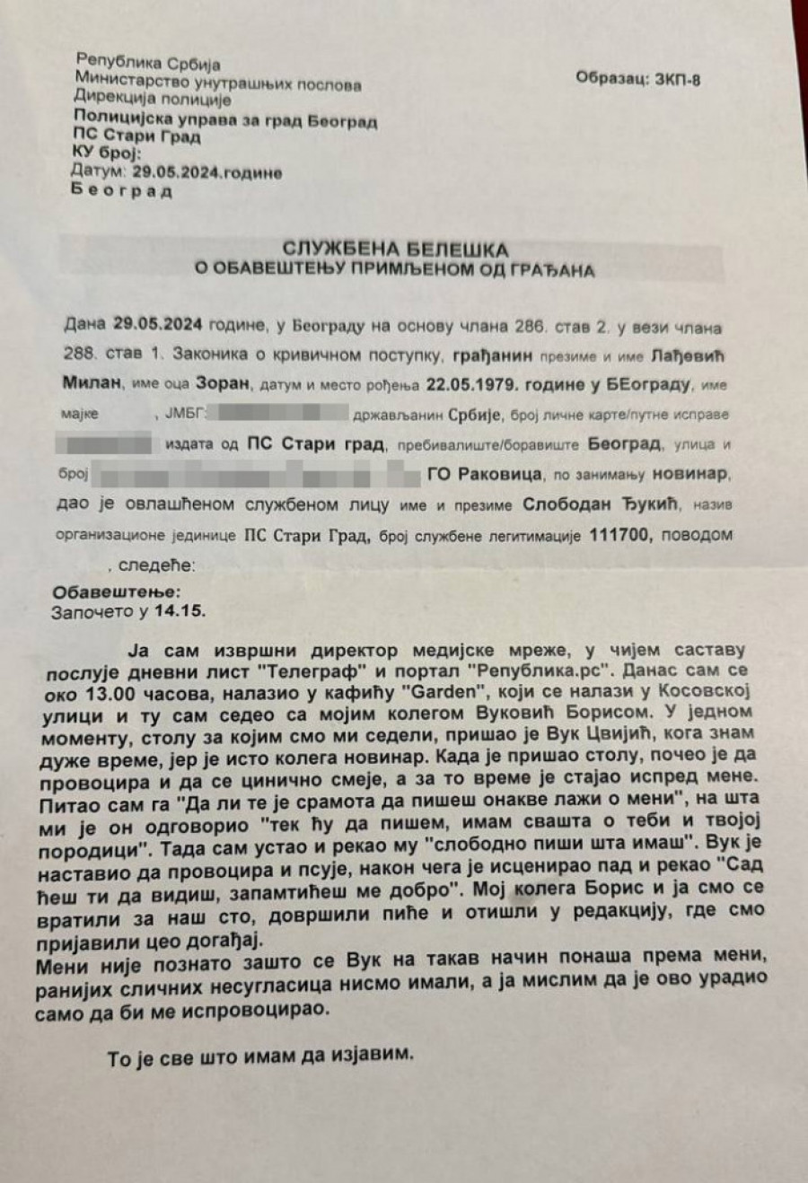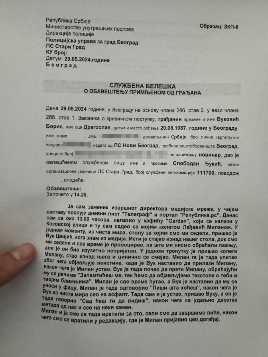 - Ja sam zamenik izvršnog direktora Medijske mreže, u čijem sastavu posluje dnevni list Srpski telegraf i portal Republika rs. Danas sam se oko 13h, nalazio u kafiću Garden, koji se nalazi u Kosovskoj ulici i tu sam sedeo sa mojim kolegom Lađević Milanom. U jednom momentu iz čista mira, stolu za kojim smo mi sedeli, prišao je Vuk Cvijić, mojeg znam iz medija. Isti je stajao iznad našeg stola, dok smo mi sedeli i sve vreme je provocirao, na šta mi nismo obratili pažnju, ali je on bio izuzetno neprijatan. U jednom trenutku je prišao mom kolegi Milanu, stao iznad njega i cinično se smejao. Milan ga je tada upitao zbog čega objavljuje neistine, kada je Vuk nastavio da prilazi Milanu, nakon čega je Milan ustao. Vuk je tada poičeo da preti Milanu, obraćuajući mu se rečima "Zapamtićeš me, tek ćemo da objavljujemo tekstove o tebi i tvojim bližnjima". Milan je sve vreme ćutao, a Vuk je nastavio da mu se unosi u facu, Milan je tada odgovorio "Piši šta hoćeš", nakon čega je Vuk iz čista mira seo na asfalt. Tada sam i ja ustao, prišao Vuku, a on je tada govorio"Sad ćeš ti da vidiš", nakon čega se udaljio desetak metara od nas i seo na neki kamen. Milan i ja smo se tada vratili za sto, seli smo da završimo piće, nakon čega smo se vratili u redakciju, gde je Milan prijavio ceo događaj - izjavio je u policijskoj stanici Boris Vuković.