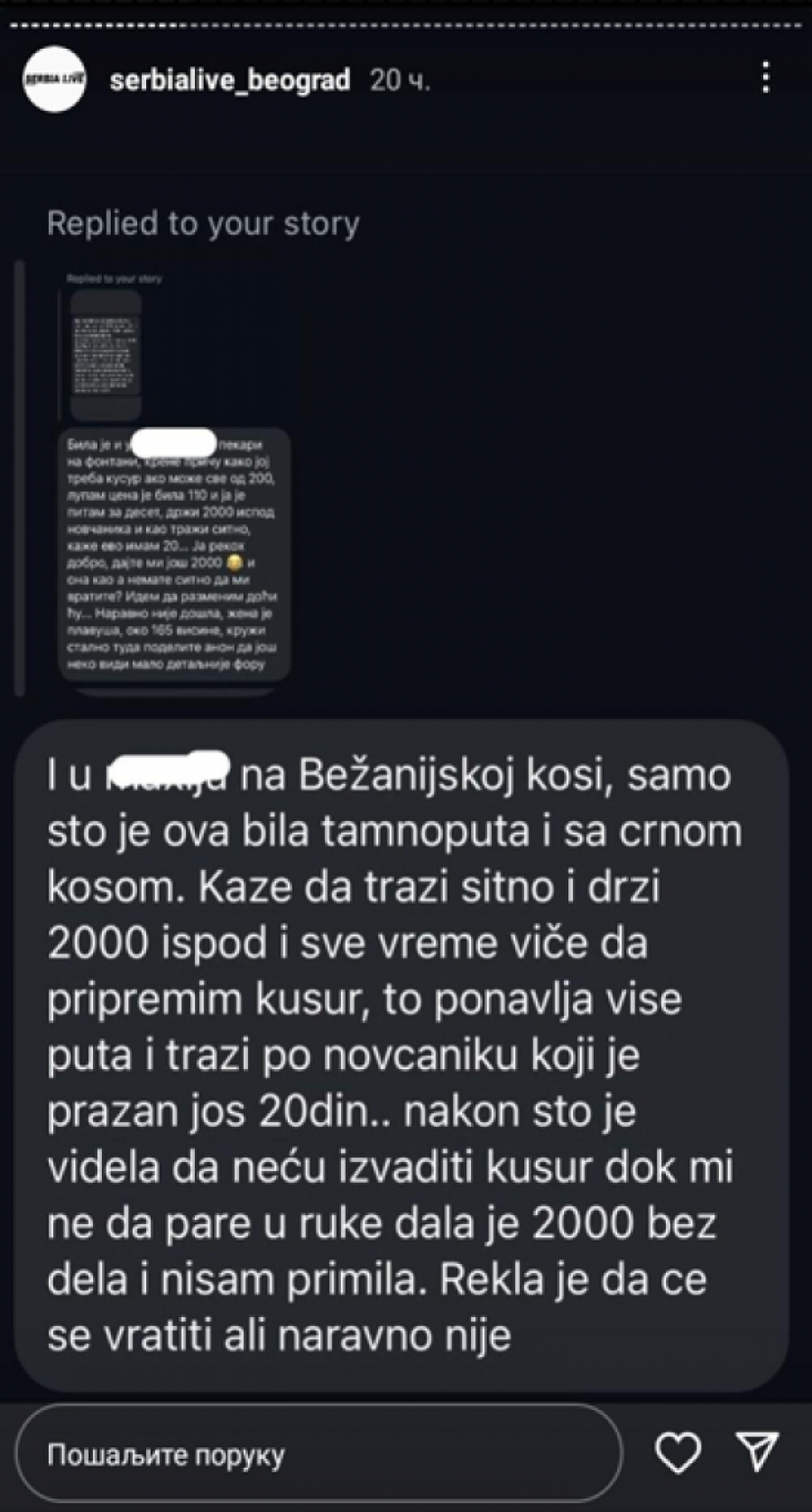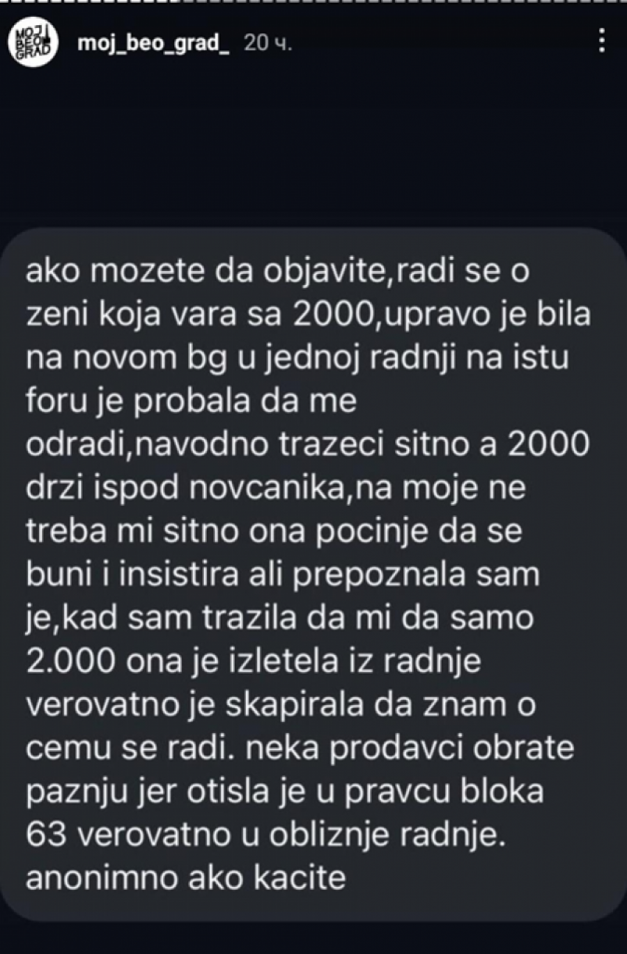 - Upravo je bila na Novom Beogradu u jednoj radnji na istu foru je probala da me odradi navodno tražeći sitno, a 2.000 drži ispod novčanika. Na moje "ne treba mi sitno" ona počinje da se buni i insistira, ali prepoznala sam je. Kad sam tražila da mi da samo 2.000 ona je izletela iz radnje verovatno je skapirala da znam o čemu se radi. Neka prodavci obrate pažnju jer otišla je u pravcu bloka 63. Verovatno u obližnje radnje - navodi se u objavi na Instagram stranici moj_beo_grad_ dok u narednoj stoji: