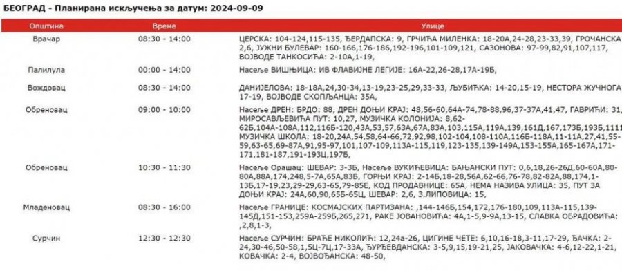 Elektrodistribucija Beograd obaveštava građane da će danas biti izvršeno isključenje struje u šest beogradskih opština zbog planiranih radova. Isključenja su započela u ponoć, a radovi će se odvijati u opštinama Vračar, Palilula, Voždovac, Obrenovac, Mladenovac i Surčin. Detaljan spisak ulica u kojima će se radovi izvoditi dat je u nastavku.