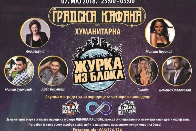 Trojka iz Bloka, koja iz godine u godinu organizuje humanitarne događaje na teritoriji Srbije i regiona, ove subote (7.maja) organizuje humanitarnu žurkuza porodice sa ćetvoro i više dece.