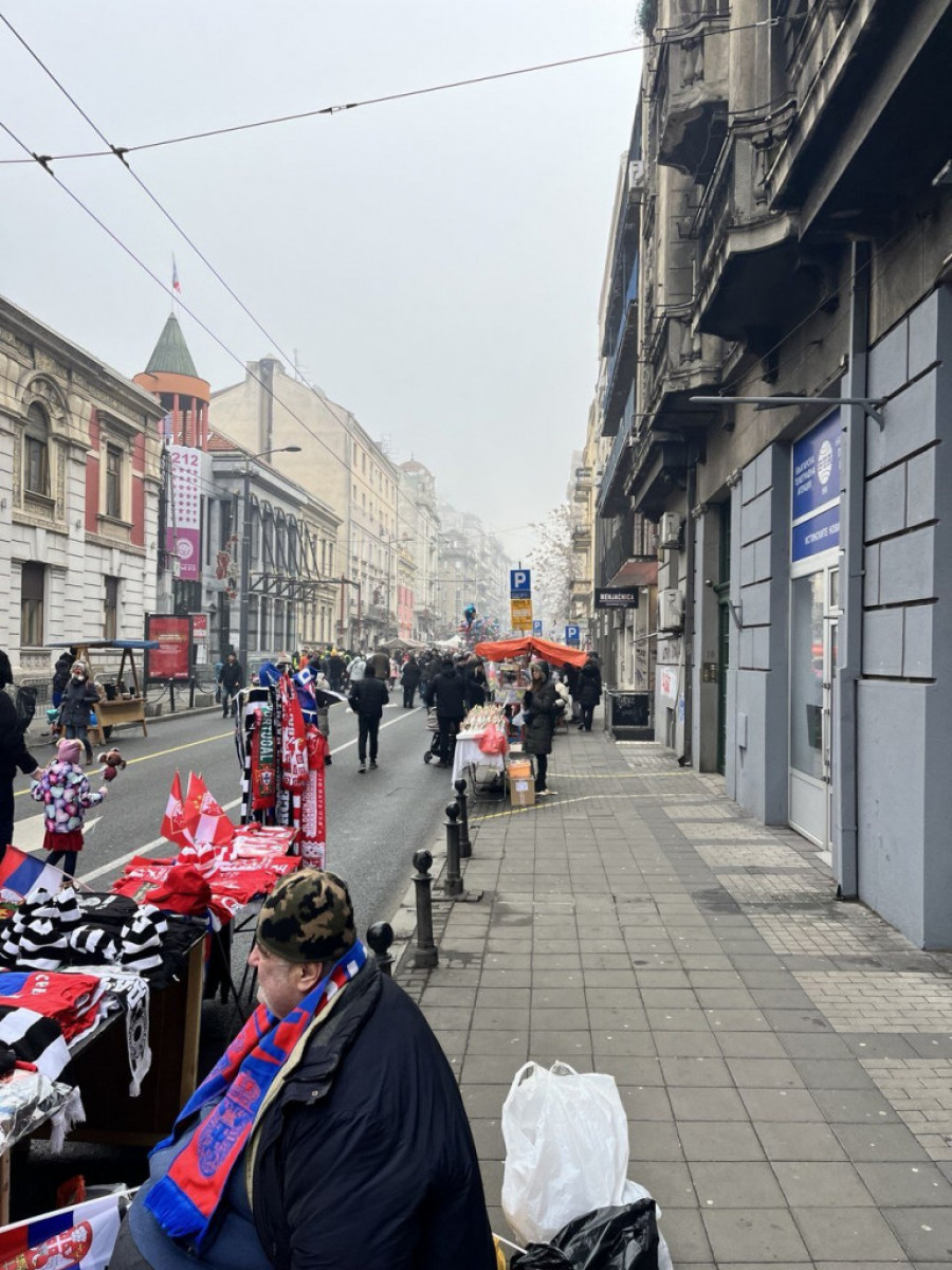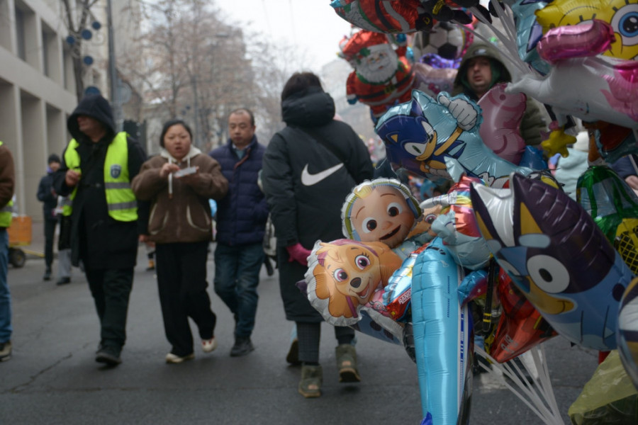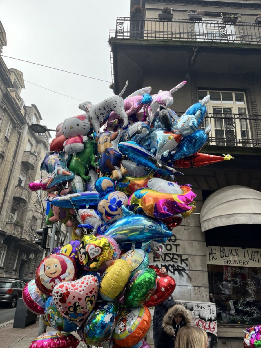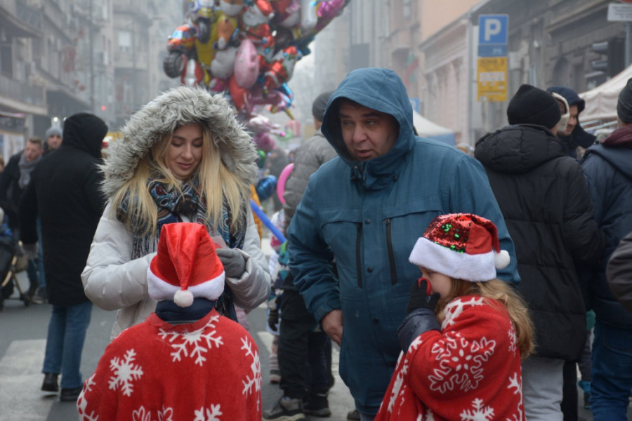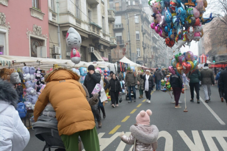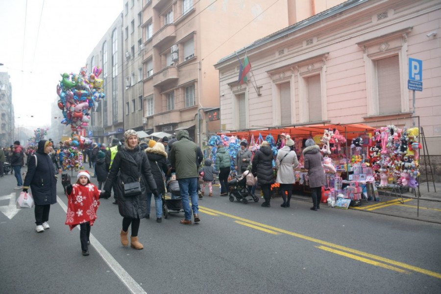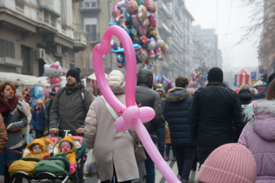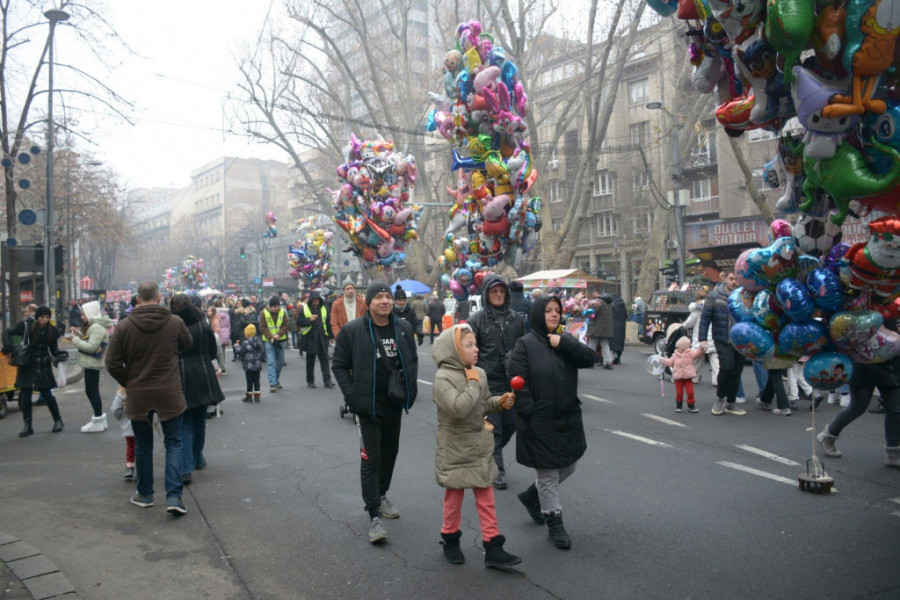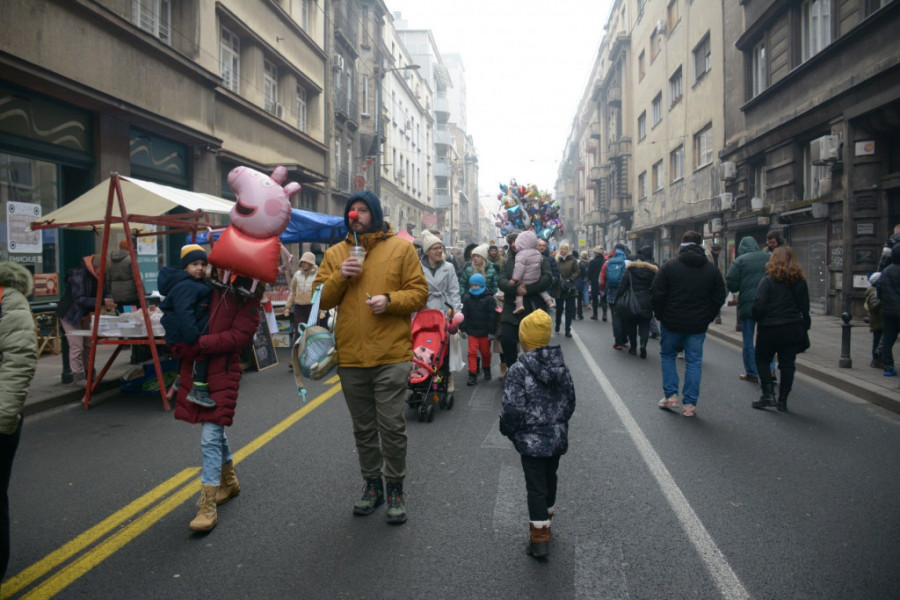 Na ulici se čuje dečja graja i prisutan je veliki broj male dece, koja sa roditeljima uživaju u slatkišima, balonima i klovnovskim nosevima.