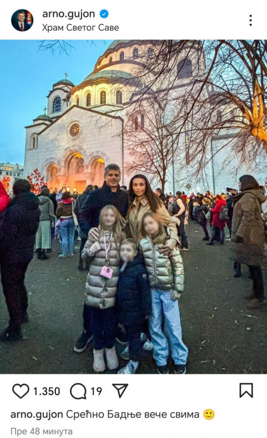 Gujon se oglasio i na svom Instagram profilu. On je objavio fotografiju na kojoj je sa suprugom i decom ispred Hrama Svetog Save. Ujedno je svim vernicima pravoslavne veroispovesti čestitao Badnji dan.