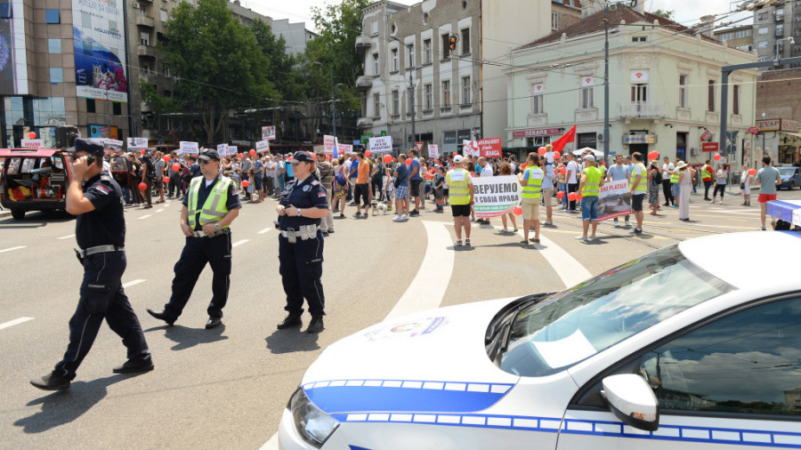 Foto: Tanjug/T. VALIČOni su tačno u podne blokirali deo kružnog toka na Slaviji za vozila iz pravca koja idu od grada ka Autokomandi i Crvenom krstu, dok su vozila iz drugog smera mogla nesmetano da prolaze.