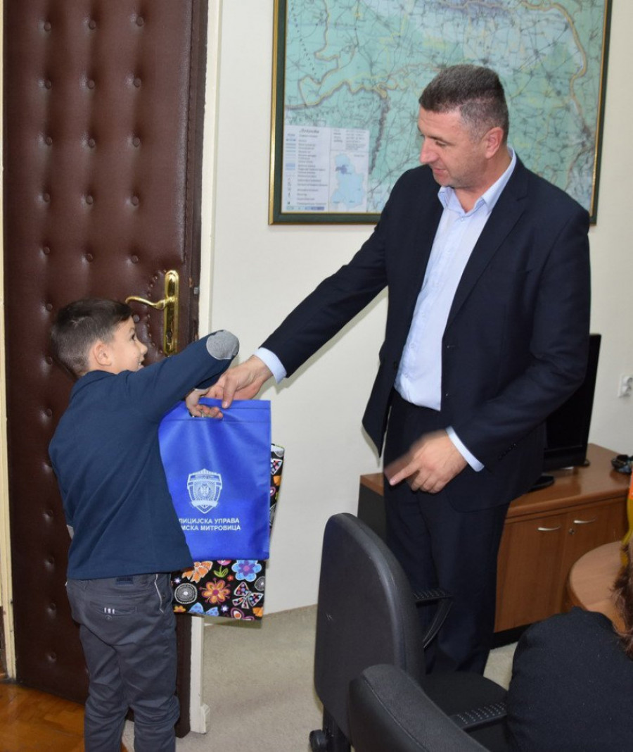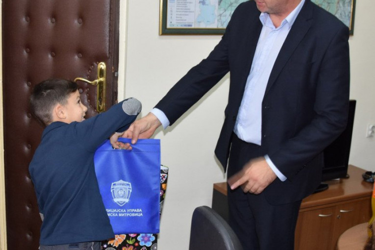 Foto: MUP SrbijeUčenika drugog razreda Osnovne škole "Jovan Jovanović Zmaj" u Martincima, koji je za "malog gradonačelnika" izabran na konkursu "Da sam gradonačelnik, ja bih..." gradske Uprave za obrazovanje, kulturu i sport, primio je načelnik Policijske uprave u Sremskoj Mitrovici Đura Mandić.