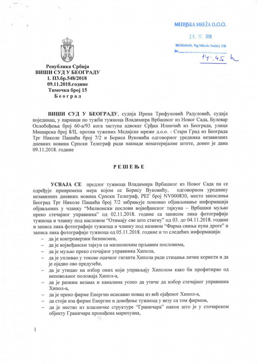 Sad više nema nikakve dileme - Irena Radulović Trifunović, sudija Višeg suda, muljala je sa kontroverznim biznismenom iz Vrbasa Vladimirom Vrbaškim. Baš kao što smo pisali prethodnih dana, a sada se i potvrdilo, ona je u korist tajkuna unapred donela rešenje kojim zabranjuje Srpskom telegrafu da piše o njemu i objavljuje njegovu sliku, a sve pod pretnjom drakonskim kaznama.