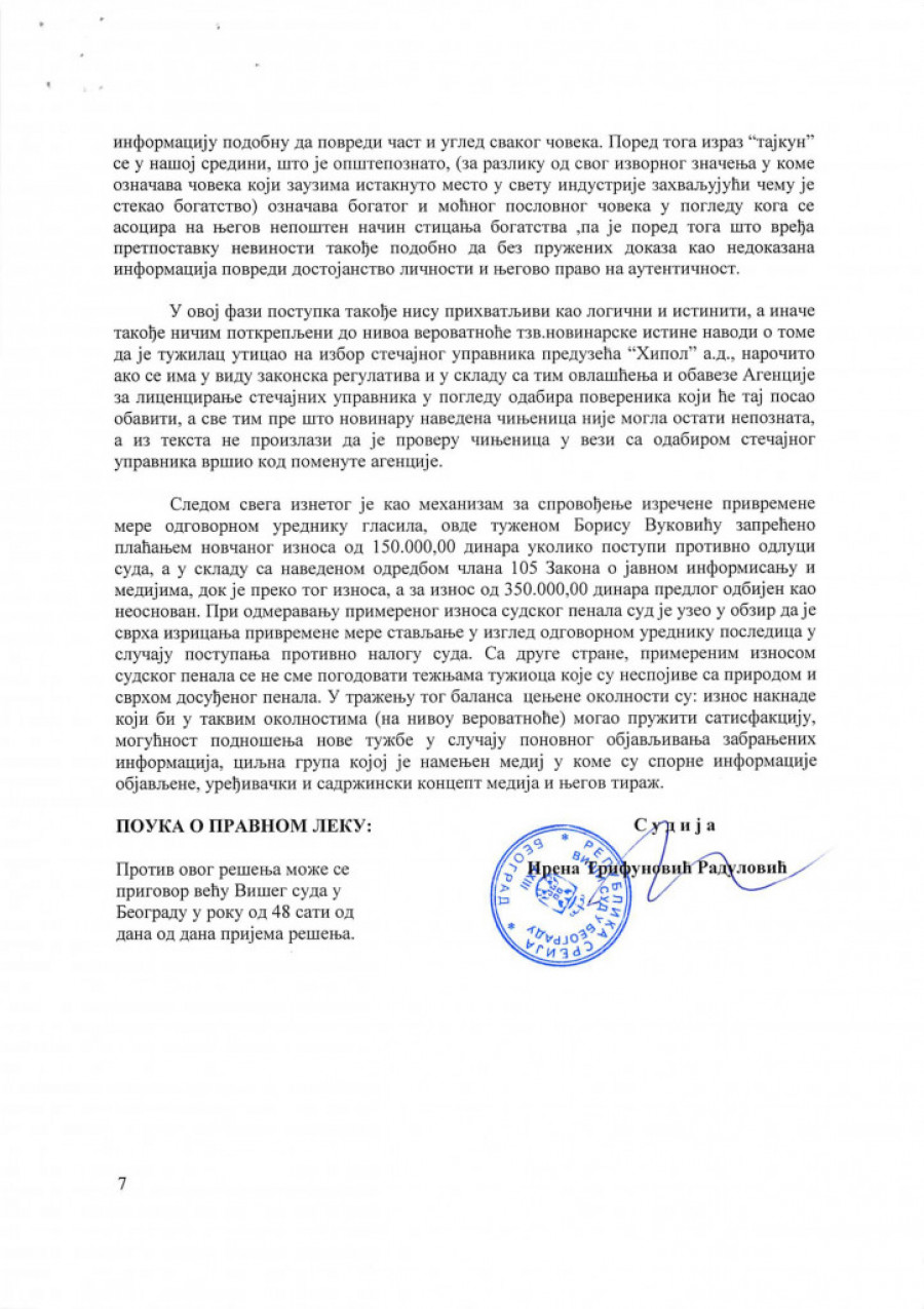- To da zabranjuju buduće tekstove vezane za određenu osobu predstavlja udar na slobodu mišljenja, a ako vi kao medij nemate takvo pravo, to je strašno. Kada bi to išlo tako, mediji ne bi smeli ni o kome da pišu.