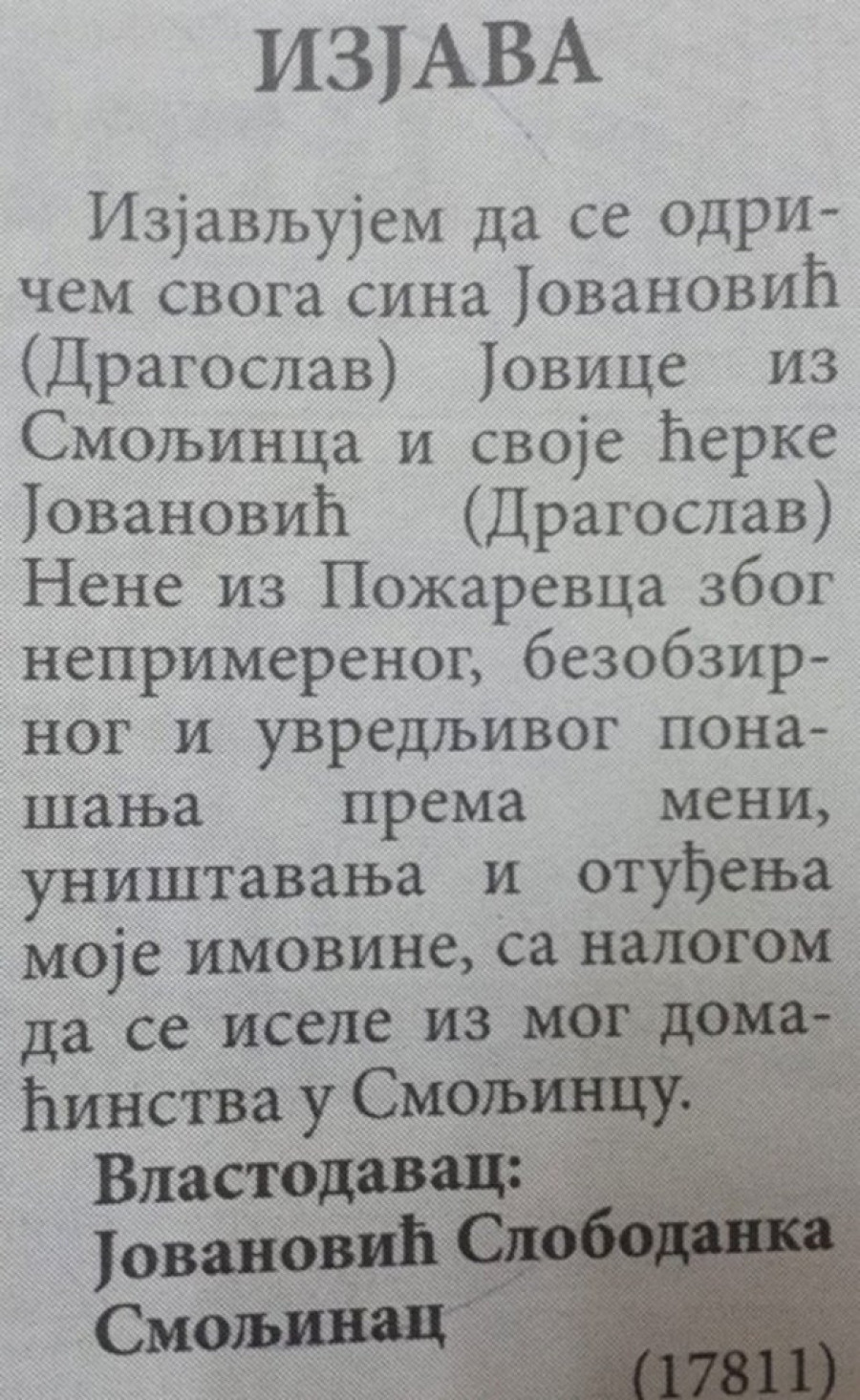 Foto: pixabay.comSada je jasno i glasno stavila do znanja da Jovica i Nena više nisu njena deca i da više nemaju šta da traže na njenom imanju: "Izjavljujem da se odričem svoga sina Jovanović (Dragoslav) Jovice iz Smoljinca i svoje ćerke Jovanović (Dragoslav) Nene iz Požarevca zbog neprimerenog, bezobzirnog i uvredljivog ponašanja prema meni, uništavanja i otuđenja moje imovine, sa nalogom da se isele iz mog domaćinstva u Smoljincu".