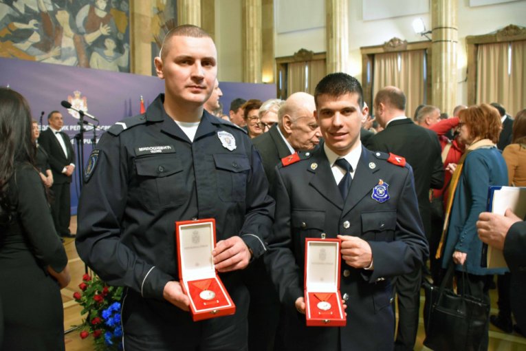 Foto: MUP SrbijeSrebrne medalje za hrabrost "Miloš Obilić" uručene su policijskom službeniku Policijske uprave Niš Milošu Miloševiću i pripadniku Vatrogasno-spasilačke jedinice u Jagodini Nemanji Radosavljeviću.
