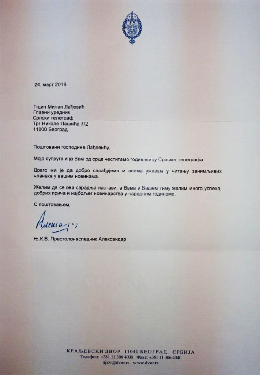 U čestitki upućenoj našim novinama, naslovljenoj na glavnog urednika Milana Lađevića, Njegovo Kraljevsko Visočanstvo prestolonaslednik Aleksandar nam sa suprugom, od srca, čestita tu treću godišnjicu.