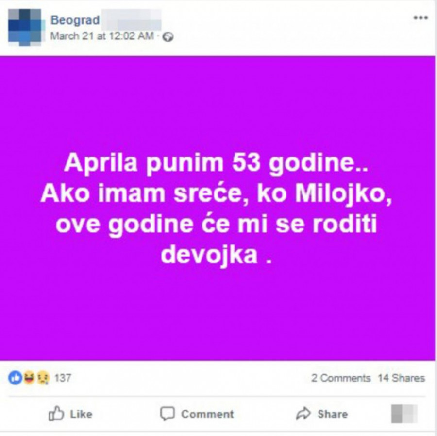 "Aprila punim 53 godine... Ako imam sreće k’o Milojko, ove godine će mi se roditi devojka", našalio se neko na Fejsbuku aludirajući na vezu mlade Milijane (21) i njenog verenika (74) i napravio hit-post koji je nasmejao Srbiju.