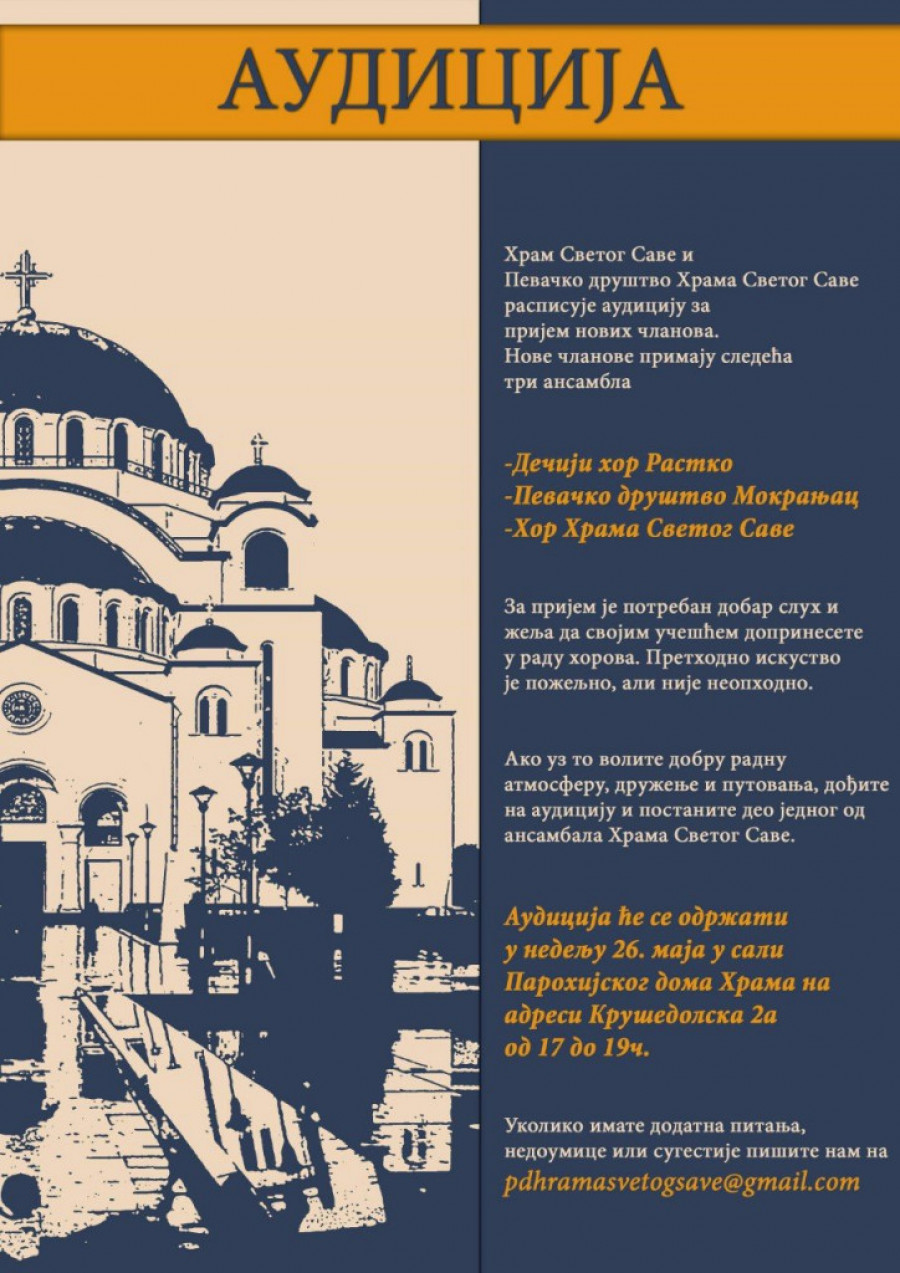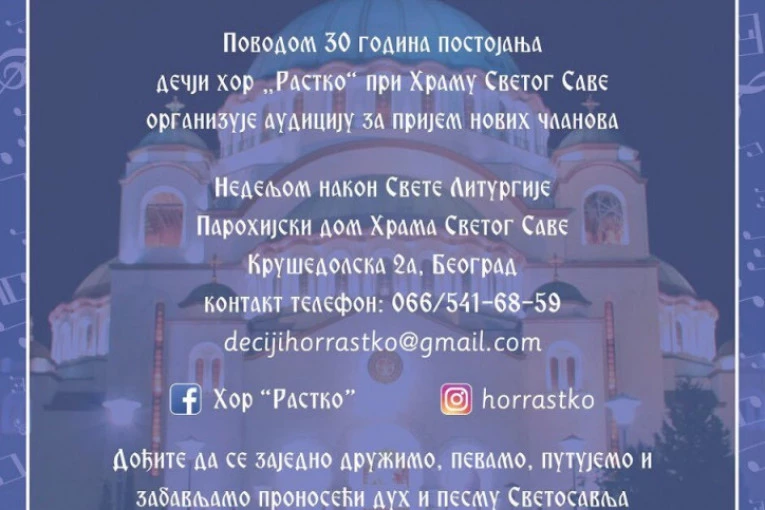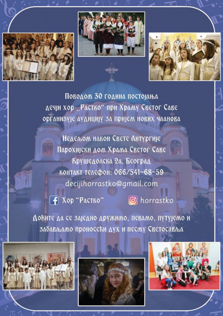 Foto: Promo fotoHor "Rastko" ove godine obeležava jubilej, tri decenije rada, a audicija je 26. maja 2019. od 17 do 19 časova u Parohijskom domu Hrama Svetog Save (Krušedolska 2a), kao i svake nedelje posle svete Liturgije.