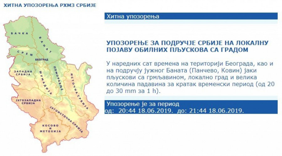 Republički hidrometeorološki zavod je izdao hitno upozorenje da se u pojedinim delovima prestonice u narednih sat vremena mogu očekivati jaki pljuskovi sa grmljavinom, ali i grad.