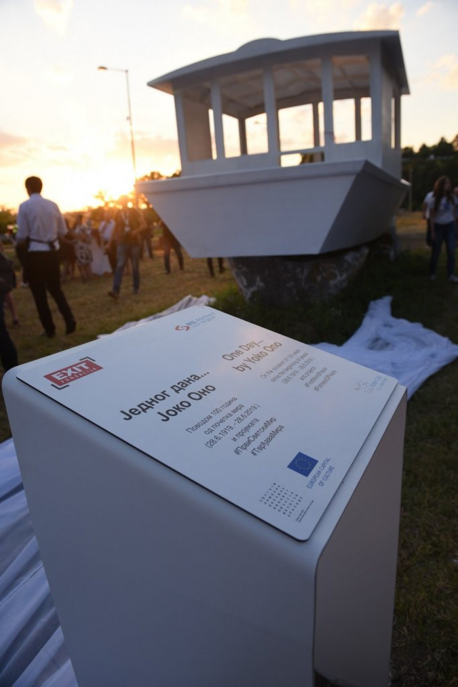 Foto: Promo- Mir je moć! Mir na Zemlji, mir sa Zemljom – poručila je legendarna multimedijalna umetnica i aktivistkinja Joko Ono u video poruci kojom se obratila visokim zvanicama na večerašnjem, svečanom otvaranju njenog umetničkog rada „One Day...“ na Petrovaradinskoj tvrđavi u Novom Sadu. Ovo umetničko delo otkrili su članovi novosadskog dečijeg hora "Melodies", i to simbolično na stogodišnjicu od potpisivanja Versajskog sporazuma 28. juna 1919. godine u Francuskoj, čime je zvanično i završen Prvi svetski rat. Američka umetnica, japanskog porekla, zajedno sa Exitom je spomenik posvetila Prvom svetskom miru, a njegov izgled inspirisan je tradicionalnim srpskim brodom, takozvanom „šajkom“. Nakon što je u svetu proslavljena kao mesto gde se održava EXIT festival, Petrovaradinska tvrđava dobiće novi zaštitni znak, a Novi Sad i Srbija novu kulturno-turističku atrakciju. Kada su uspostavili saradnju zahvaljujući zajedničkim kontaktima u svetskim muzičkim krugovima, Joko Ono i EXIT su osmislili ovaj projekat koji je realizovan uz podršku kompanije NIS, Evropske prestonice kulture i Novog Sada, grada mira, saradnje i kulture.