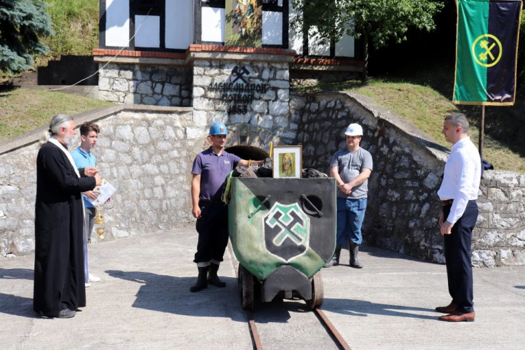 Foto: Tanjug/D.ANIČIĆOni danas obeležavaju i rudarsku slavu Svetog Prokopija, a slavski kolač presekli su ispred jame "Aleksnadrov potok" gde su ga u vagonetu punom "dogurala" dvojica rudara.