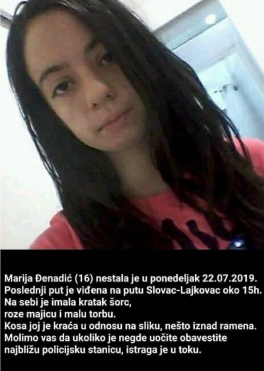 Devojčica Marija Đenadić (16) nestala je u ponedeljak, 22. jula, a poslednji put je viđena oko 15 časova, na putu Slovac - Lajkovac. Na sebi je imala kratak šorts, roze majicu i torbicu.