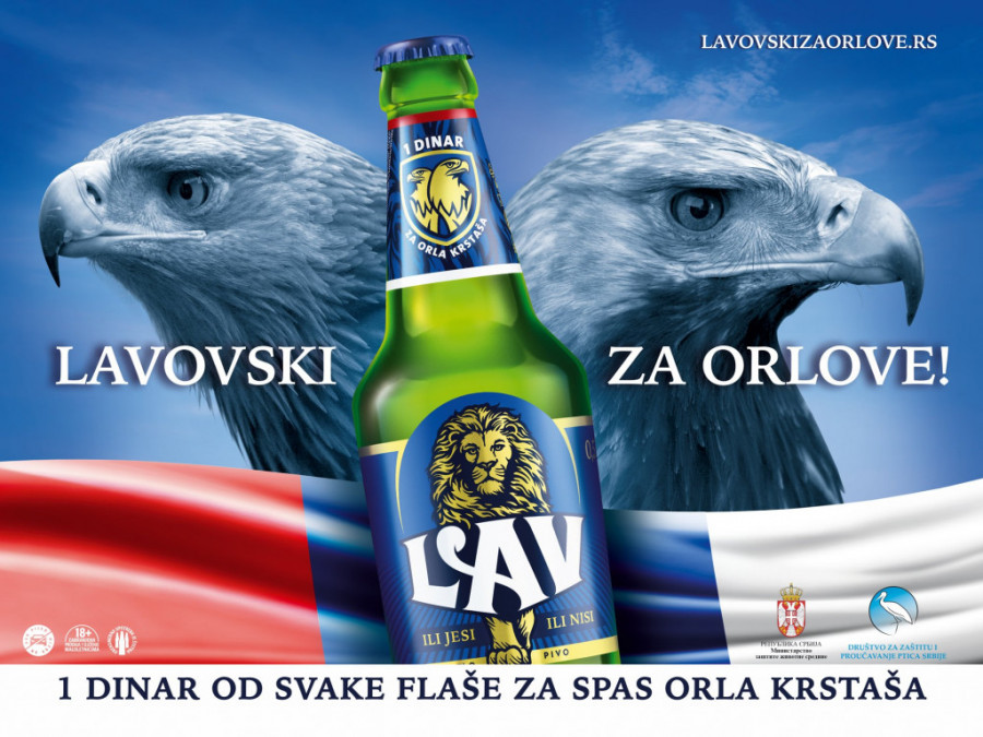 Podsećamo, Lav pivo je, u saradnji sa Ministarstvom zaštite životne sredine i Društvom za zaštitu i proučavanje ptica Srbije, pokrenulo kampanju “Lavovski za orlove”, koja ima za cilj obnavljanje brojnosti orla krstaša u Srbiji. Tako će po jedan dinar od svake prodate 0.5 flaše Lav piva biti odvojen za obnovu staništa ove fascinantne ptice, koja je, uprkos činjenici da celu istoriju predstavlja simbol sa grba naše zemlje, danas u Srbiji na rubu opstanka.