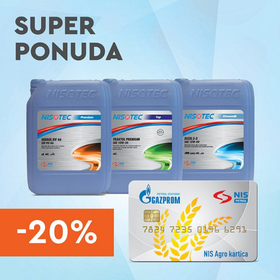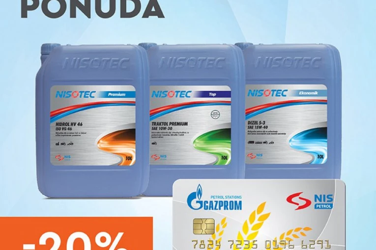 Foto: Promo fotoDo kraja septembra, uz NIS Agro karticu potrošače očekuje 20 odsto popusta prilikom kupovine odabranih NISOTEC ulja za poljoprivrednu mehanizaciju, u pakovanjima od 10 i 20 litara. Reč je o dodatnoj pogodnosti namenjenoj korisnicima NIS Agro kartice koja tokom cele godine poljoprivrednicima obezbeđuje mnogobrojne popuste na gorivo i dopunski asortiman u okviru najveće maloprodajne mreže naftnih derivata na domaćem tržištu, odnosno na više od 300 NIS Petrol i GAZPROM maloprodajnih objekata širom Srbije.