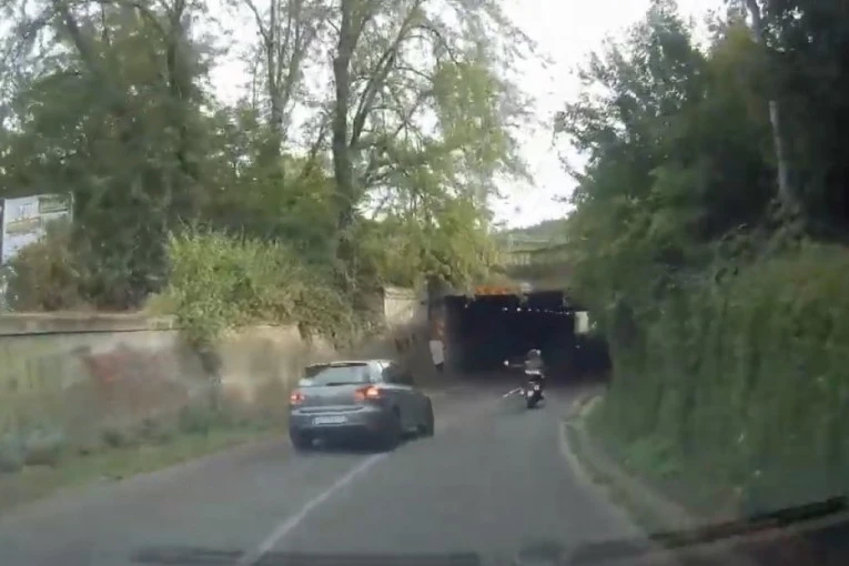 Na snimku je zabeležen trenutak kako vozač na skretanju ispred podvožnjaka pretiče preko pune linije jedno vozilo, a onda je pokušao da pretekne i motociklistu.