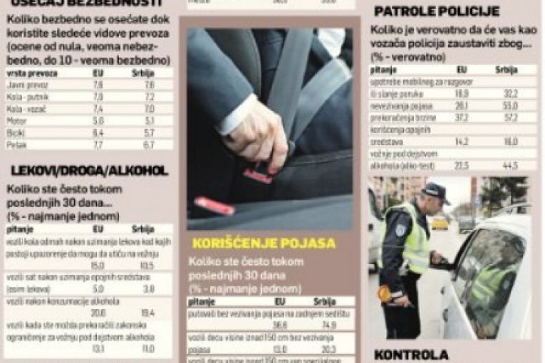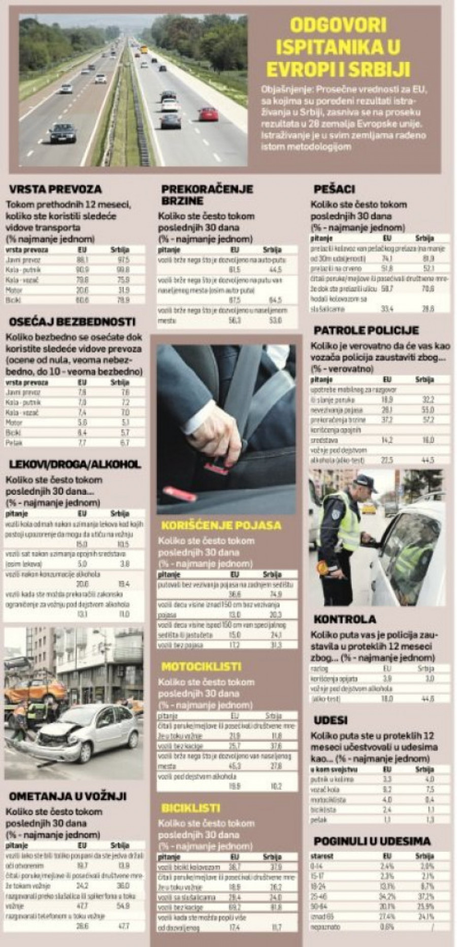 U poređenju sa rezultatima istraživanja u zemljama EU, ispitanici u Srbiji su u manjoj meri prijavili da upravljaju vozilom nakon konzumiranja alkohola, kao i da manje prekoračuju brzinu. S druge strane, naši vozači mnogo više koriste mobilni telefon u toku vožnje, i to ne samo za razgovor već i za čitanje poruka i mejlova i pristupanje društvenim mrežama. Takođe, Srbi manje koriste pojaseve, više krše propise kao pešaci, manje vezuju decu i manje koriste specijalna sedišta za njihov prevoz.
