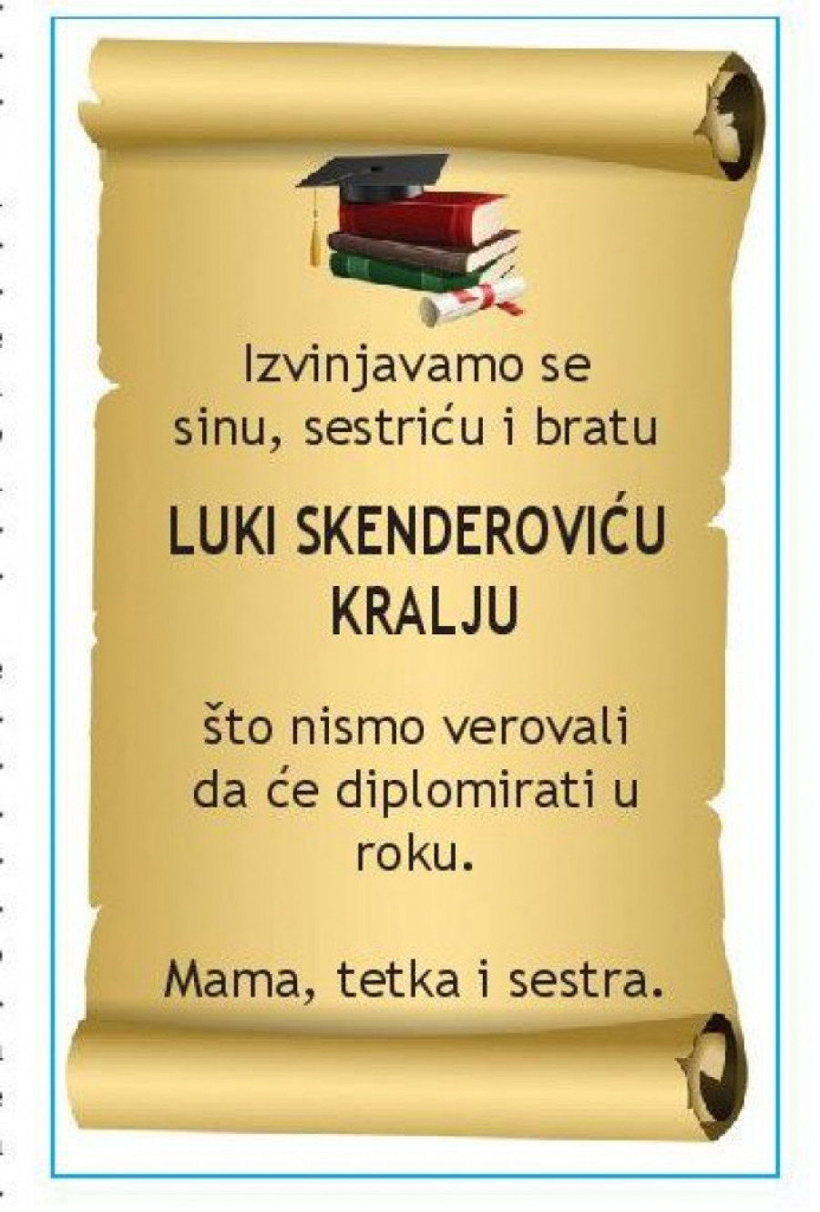 - Dala sam mu rok od pet godina, otac mu je rekao neka bude i deset samo neka završi, ali naš Luka je diplomirao u roku i zatražio je da se izvinimo. Izgubili smo opkladu i pristali da mu se javno izvinimo.