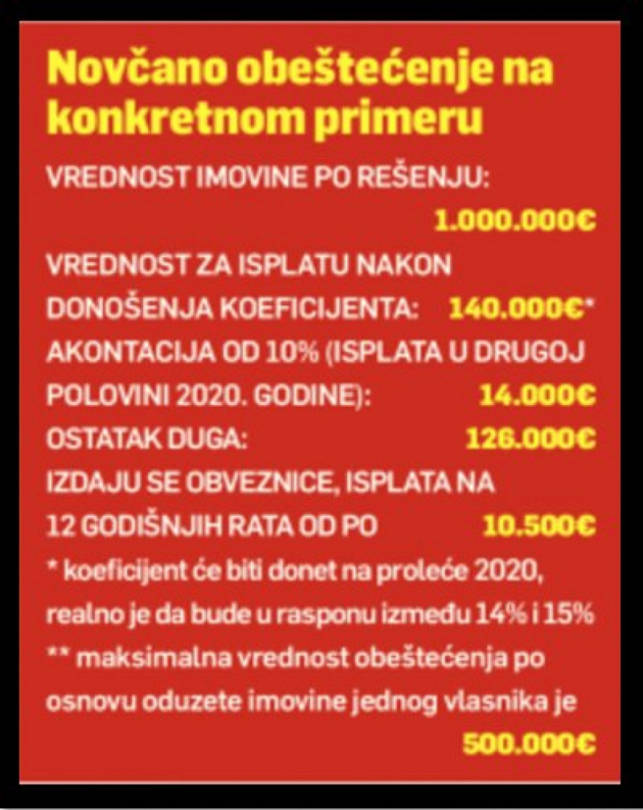 Nema više odlaganja. Akontacija u visini od 10 odsto sume predviđene za obeštećenje, u onom delu restitucije koji će se sprovesti u novcu, naslednicima vlasnika oduzete imovine biće isplaćena u drugoj polovini sledeće godine. Pre toga, na proleće, biće doneta dugoočekivana odluka o koeficijentima, koja će u stvari suštinski odrediti u kom procentu će ljudi biti namireni u odnosu na doneta rešenja kojima se konstatuje vrednost imovine oduzete članovima njihovih porodica nakon Drugog svetskog rata. Realno je da taj procenat bude između 14 i 15 odsto.