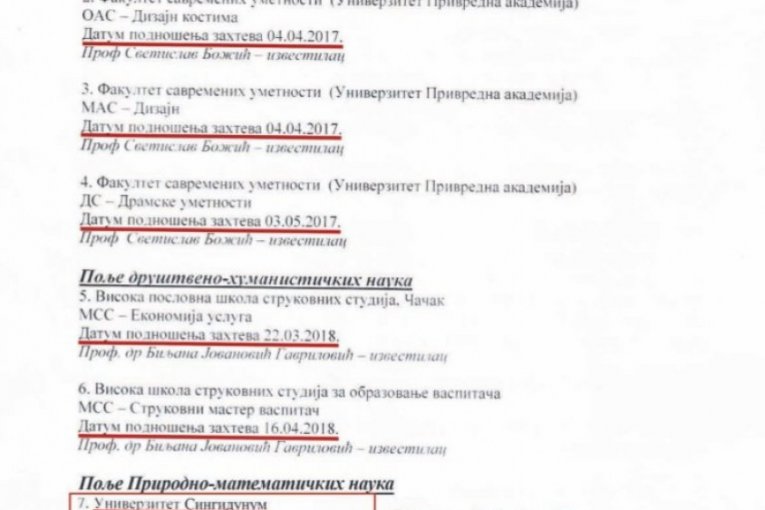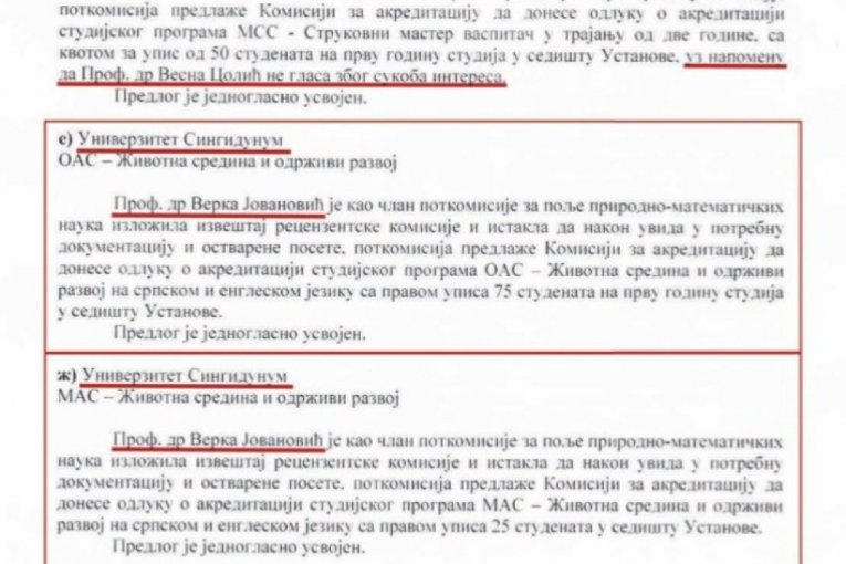 - To nije tačno. Članove recenzentske komisije nikada ne predlaže pojedinac, već potkomisija za oblast za koju se imenuje recenzent. Ja sam koordinator potkomisije prirodno-matematičkog polja, nisam ni Singidunum ni Beogradski univerzitet niti bilo koji drugi. Kao koordinatorka, ja sam u obavezi da čitam sve izveštaje, dok prilikom izbora recenzentske komisije na sednicima samo čitam imena i ne predlažem ništa - tvrdi profesorka Jovanović iako se iz zapisnika sa sednica sve jasno vidi.