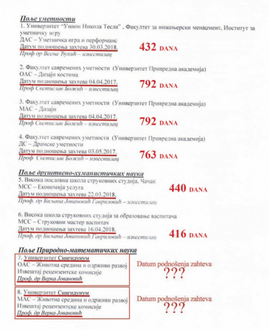 Foto: ST/V. LUKIĆTaj rok se, međutim, ne može pouzdano utvrditi jer u zapisniku sa sednice KAPK na kojoj se odlučivalo o akreditacijama jedino kod Singidunuma (očigledno nimalo slučajno) nema datuma kada je prijava podneta. Ono što se zna jeste da je rok svakako bio kraći od 90 dana s obzirom na to da prijava tog univerziteta Ministarstvu prosvete nije podneta pre marta, a KAPK je zasedao u junu.