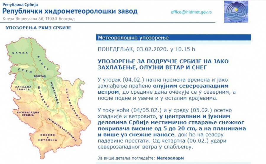 Republički hidrometeorološki zavod upozorio je da se sutra očekuje nagla promena vremena i jako zahlađenje, praćeno olujnim severozapadnim vetrom!