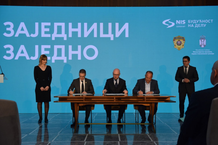 Foto: NISTakođe, razmenjeni su i sporazumi o saradnji između kompanije NIS i lokalnih samouprava, partnera programa društvene odgovornosti „Zajednici zajedno“. Kroz ovaj program NIS će uložiti 114,5 miliona dinara u osnovne i srednje škole u 12 gradova i opština u Srbiji - Beogradu, Novom Sadu, Požarevcu, Nišu, Čačku, Zrenjaninu, Pančevu, Kikindi, Kanjiži, Novom Bečeju, Srbobranu i Žitištu. Sredstva su namenjena za opremanje obrazovnih ustanova u navedenim gradovima savremenim bezbednosno-informacionim sistemima i digitalizaciju nastavnog programa. Na ovaj način NIS želi da doprinese bezbednosti dece u školama, kao i da učenicima obezbedi bolje uslove za sticanje novih znanja i veština.
