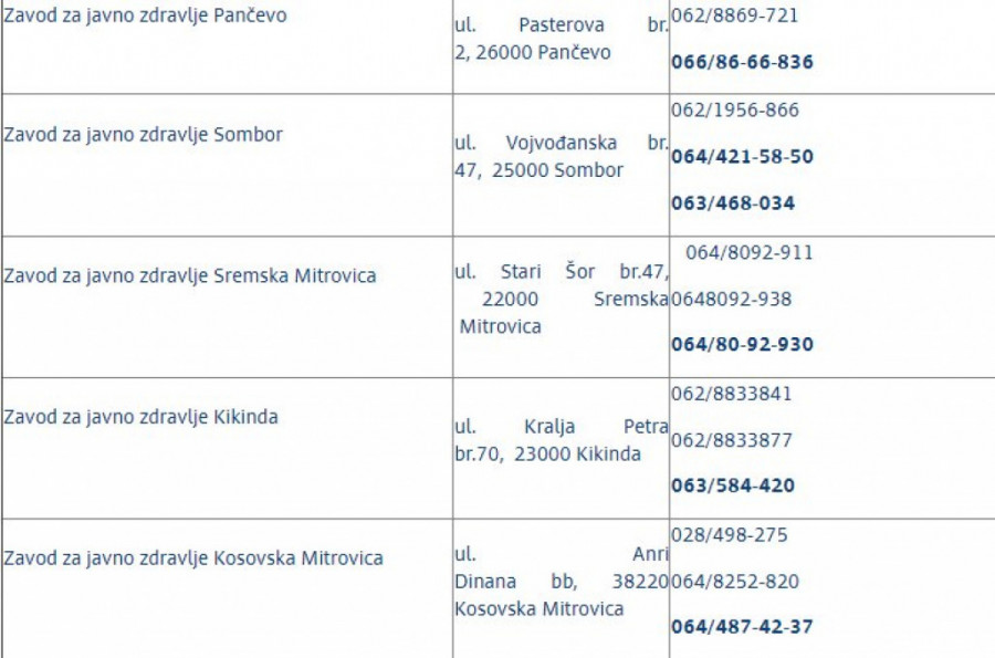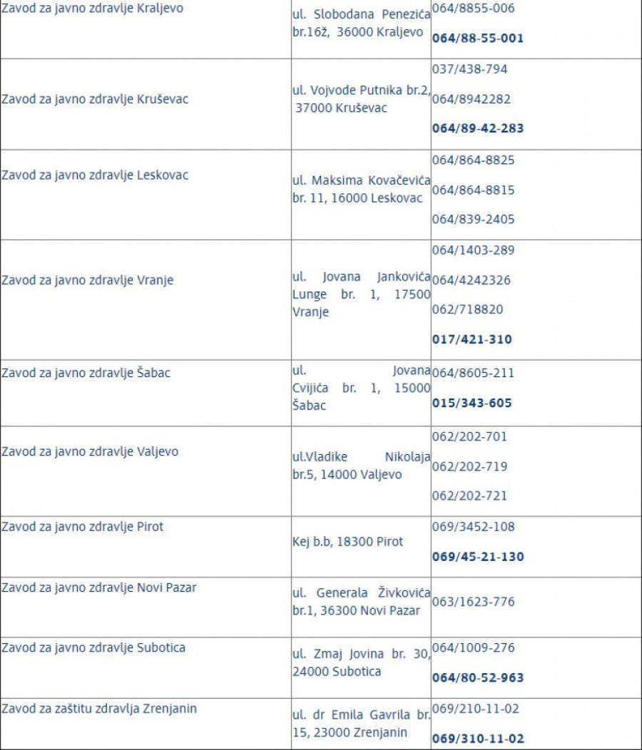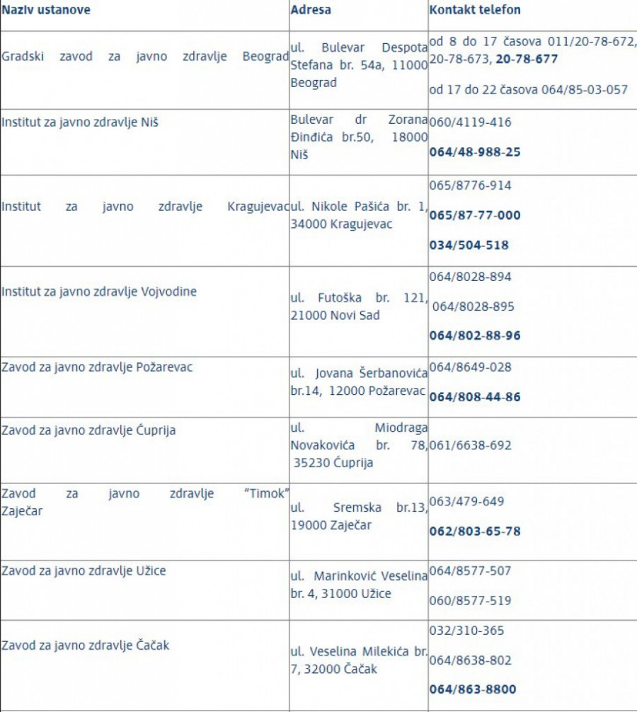 Za bliže informacije možete kontaktirati 064 8945 235 (broj koji je otvorilo Ministarstvo zdravlja), zatim Institut za javno zdravlje Srbije "Dr Milan Jovanović–Batut" (ul.Dr Subotića br.5, 11000 Beograd; Tel: 011 2684 566) ili institute/zavode za javno zdravlje na teritoriji na kojoj boravite :