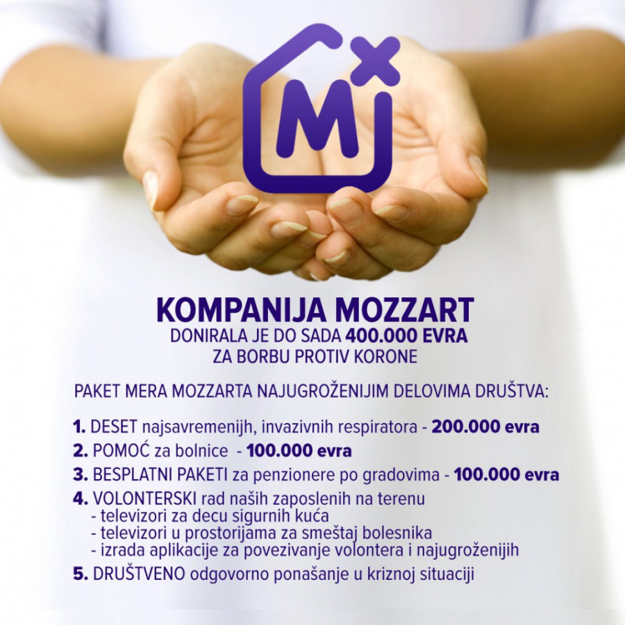 Foto: Promo fotoMozzart je obezbedio 10.000 besplatnih paketa za najstarije sugrađane kojima je zabranjeno kretanje. Pakete su zaposleni Mozzarta, volontirajući dostavljali na kućni prag penzionerima u Čačku, Beogradu, Nišu, Novom Sadu, Valjevu... U saradnji sa KK Borac i našim najtrofejnijim fudbalskim klubom Crvena zvezda, zajedno sa prvotimcima ovih klubova, volonteri kompanije Mozzart ulepšali su dan simpatizerima pomenutih klubava u Čačku i Beogradu, ali akciju podele besplatnih paketa nastavljaju i širom Srbije.