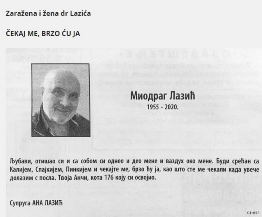 ČEKAJ ME, BRZO ĆU JA Supruga Ana Lazić takođe je pozitivna na koronu, leči se u KC Niš i nije na respiratoru, a nalazi su joj juče bili nešto bolji nego prethodnog dana.