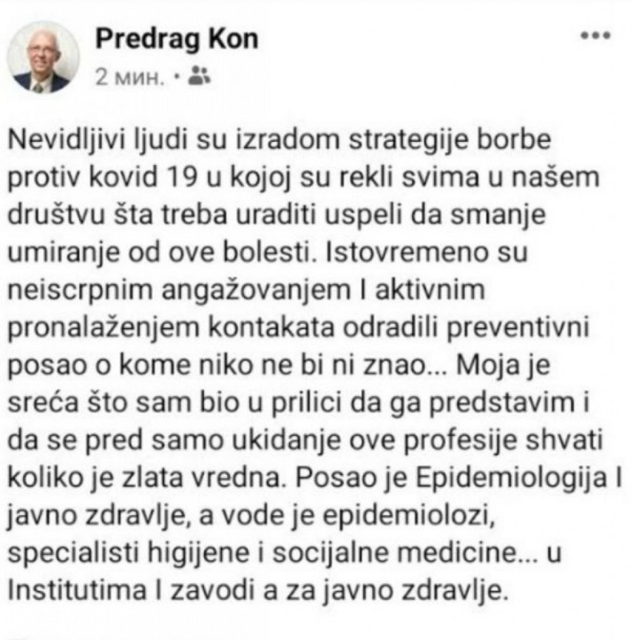 Foto: Tanjug/T. RADOVANOVIĆ- Nevidljivi ljudi su izradom strategije borbe protiv Covid 19 u kojoj su rekli svima u našem društvu šta treba uraditi uspeli da smanje umiranje od ove bolesti. Istovremeno su neiscrpnim angažovanjem i aktivnim pronalaženjem kontakata odradili preventivni posao o kome niko ne bi ni znao... Moja je sreća što sam bio u prilici da ga predstavim i da se pred samo ukidanje ove profesije shvati koliko je zlata vredna. Posao je Epidemiologija i javno zdravlje, a vode je epidemiolozi, specialisti higijene i socijalne medicine... u Institutima i Zavodima za javno zdravlje - napisao je Kon.
