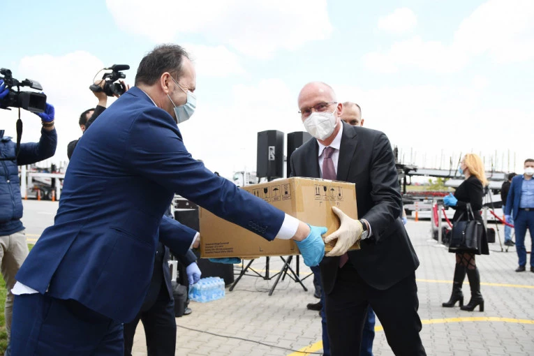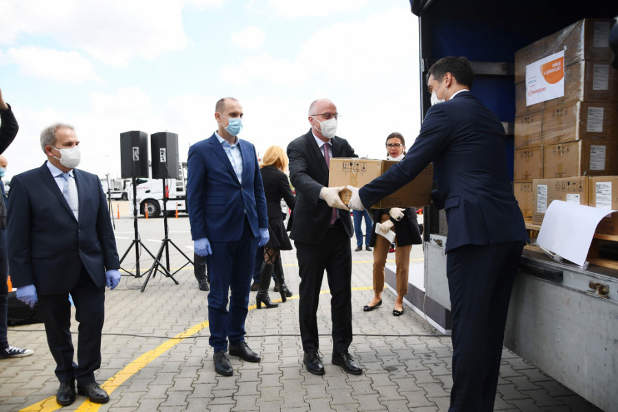 Foto: Dragan Gojić„Poruka ‘Srbiji s ljubavlju’ koja je ispisana na kamionu sa pošiljkom ove značajne medicinske opreme, sažima osećanje svih 6 hiljada radnika naše matične kompanije Štade i svih radnika Hemofarma koji su i u ovim vremenima radili u 3 smene, 7 dana u nedelji kako bi obezbedili sigurno snabdevanje lekovima“ – poručio je iz Nemačke, odakle je humanitarna pošiljka i krenula, dr Ronald Zeliger, direktor Hemofarma.