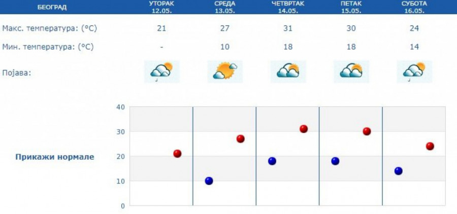 Foto: RHMZ/printscreenSreda: Pretežno sunčano i ponovo osetno toplije. Vetar slab i umeren, u skretanju na južni i jugoistočni. Najniža temperatura od 7 do 12, a najviša u većem delu od 27 do 31, samo u Negotinskoj Krajini oko 25 stepeni.