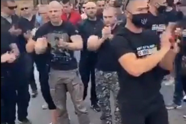 Foto: twitter.com/GrađaninPred migrantskim centrom je bilo nekoliko desetina članova ili simpatizera Levijatana, Četničke omladine i Nacionalnog korpusa, koji su pevali "Hriste bože" iz filma "Kosovski boj" i pozdravljali dignutom rukom sa sastavljena tri prsta.