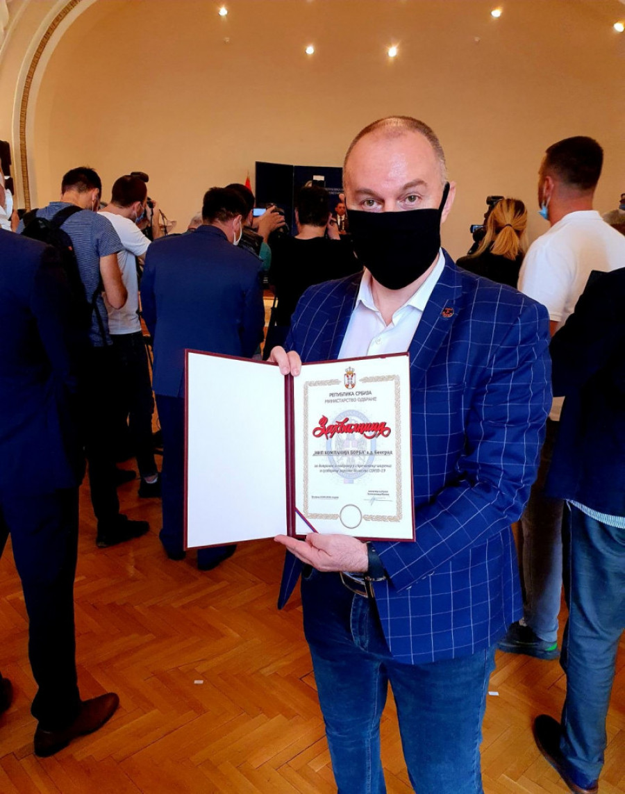 Foto: BorbaZahvalnicu za doprinos tokom borbe u suzbijanju zarazne bolesti Kovid-19 od Ministarstva odbrane primio je Andrija Jorgić u ime Kompanije "Borba".