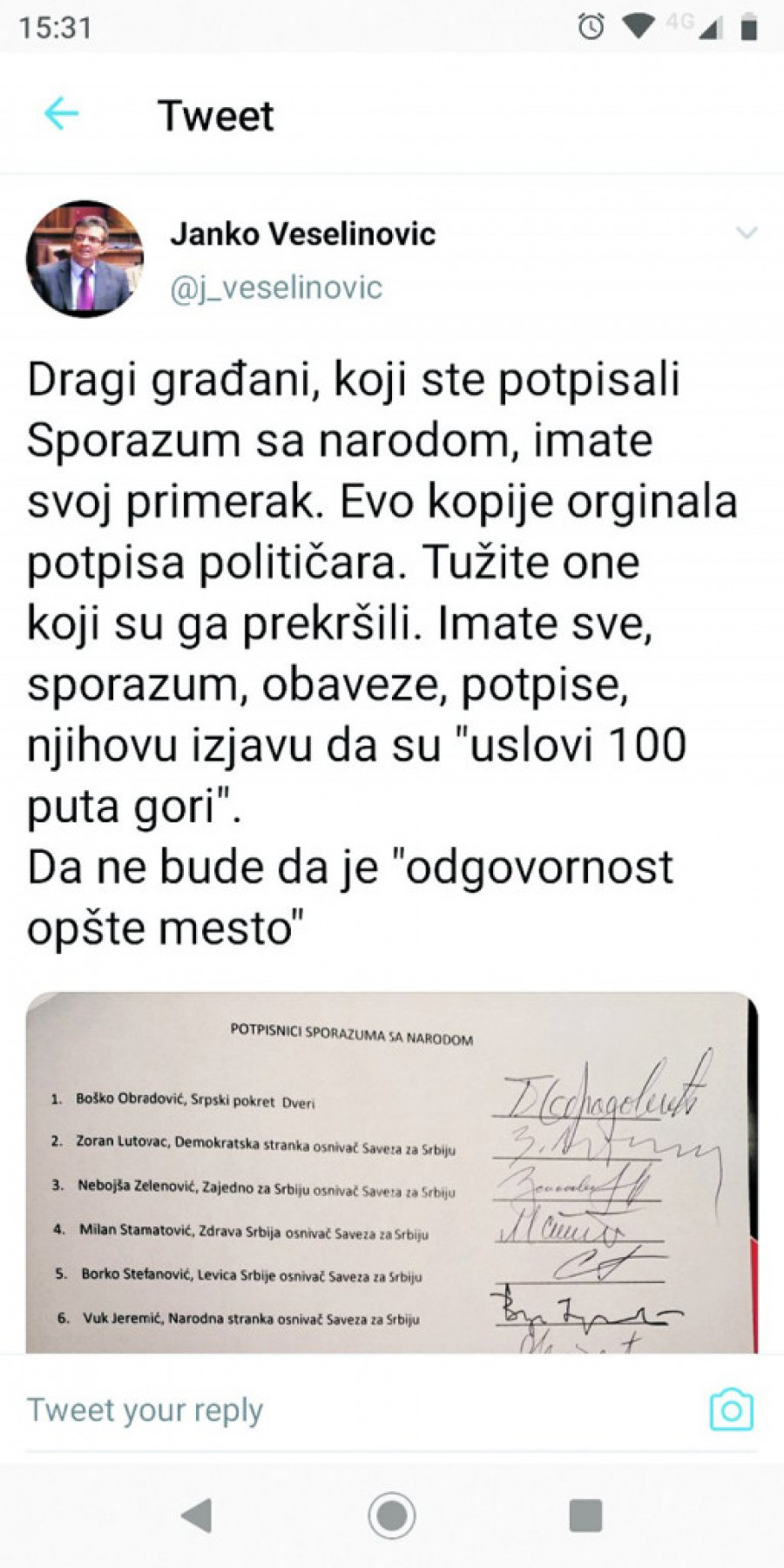 - Dragi građani koji ste potpisali sporazum sa narodom, imate svoj primerak. Evo kopije originala potpisa političara. Tužite one koji su ga prekršili. Imate sve, sporazum, obaveze, potpise, njihovu izjavu da su "uslovi 100 puta gori". Da ne bude da je "odgovornost opšte mesto" - napisao je Veselinović.
