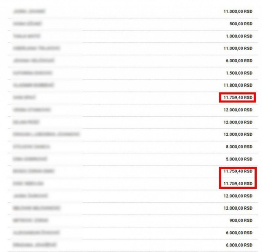 Najmanje 208 punoletnih građana Srbije uplatilo je iznos od 11.759,40 i 11.759,00 dinara na račune Sofije Markuljević. Ali veliki je broj i onih koji su uplaćivali iznose 11.760, 11,500, 11.800 i slične pa sa pravom "sumnjamo" da je i to novac od jednokratne pomoći građanima.