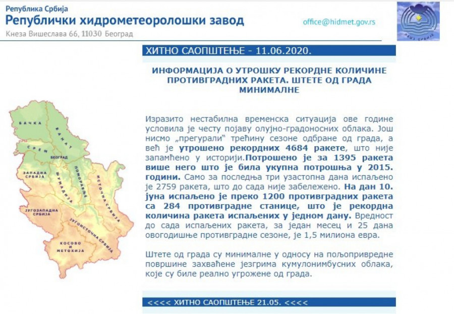 - Na dan 10. juna ispaljeno je preko 1200 protivgradnih raketa sa 284 protivgradne stanice, što je rekordna količina raketa ispaljenih u jednom danu. Vrednost do sada ispaljenih raketa, za jedan mesec i 25 dana ovogodišnje protivgradne sezone, je 1,5 miliona evra - navode iz Zavoda.