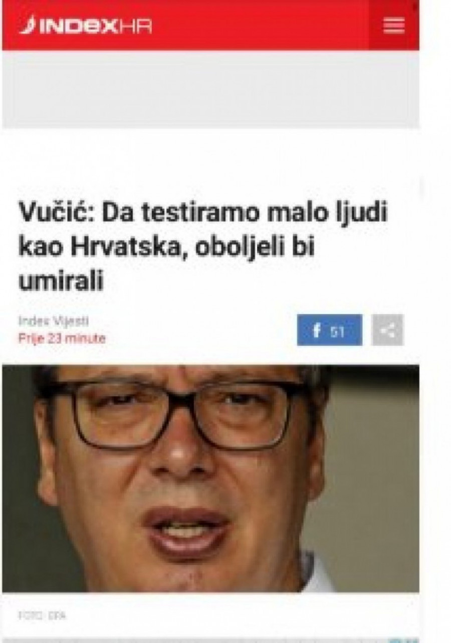 Foto: printscreenHrvatski portal objavio je vest o obraćanju predsednika Republike Srbije Aleksandra Vučića koji je večeras saopštio lepe vesti za sve građane Srbije, ali je govorio i o tome kako Hrvati testiraju svoje građane, i da Srbija testira mnogo više.