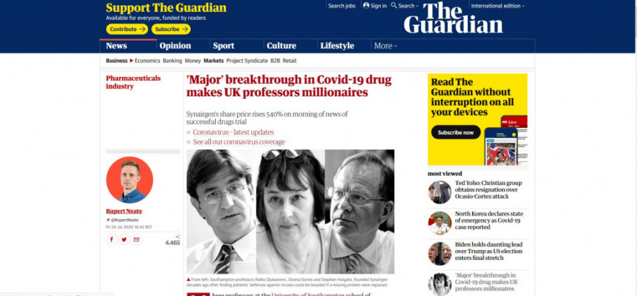 Istog dana, samo u poslepodnevnim časovima, Gardijan na svom sajtu objavljuje tekst o Ratku Đukanoviću i njegovim kolegama koji u kompaniji Sinairgen razvijaju lek protiv kovid-19. U tekstu se opširno govori o velikom otkriću do koga je došao Đukanović sa svojim saradnicima. Reč je o proteinu "interferon beta", koji se pojavljuje kod osoba koje imaju hronične bolseti pluća i disajnih puteva. Ovo važno saznanje od pre nekoliko godina sada ima važnu ulogu u sprečavanju daljeg širenja pandemije.