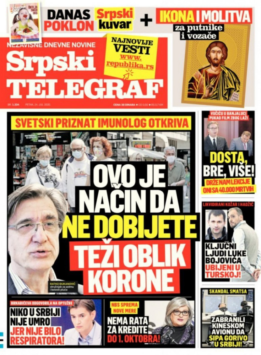 Foto: Sprkis telegrafU petak, 24. ovog meseca, Srpski telegraf je kao svoju naslovnu vest objavio razgovor sa čuvenim lekarom iz Engleske Ratkom Đukanovićem. Svetski priznati stručnjak je govorio o tome koje su najbolje metode zaštite od koronavirusa dok se ne pojavi efikasan lek.