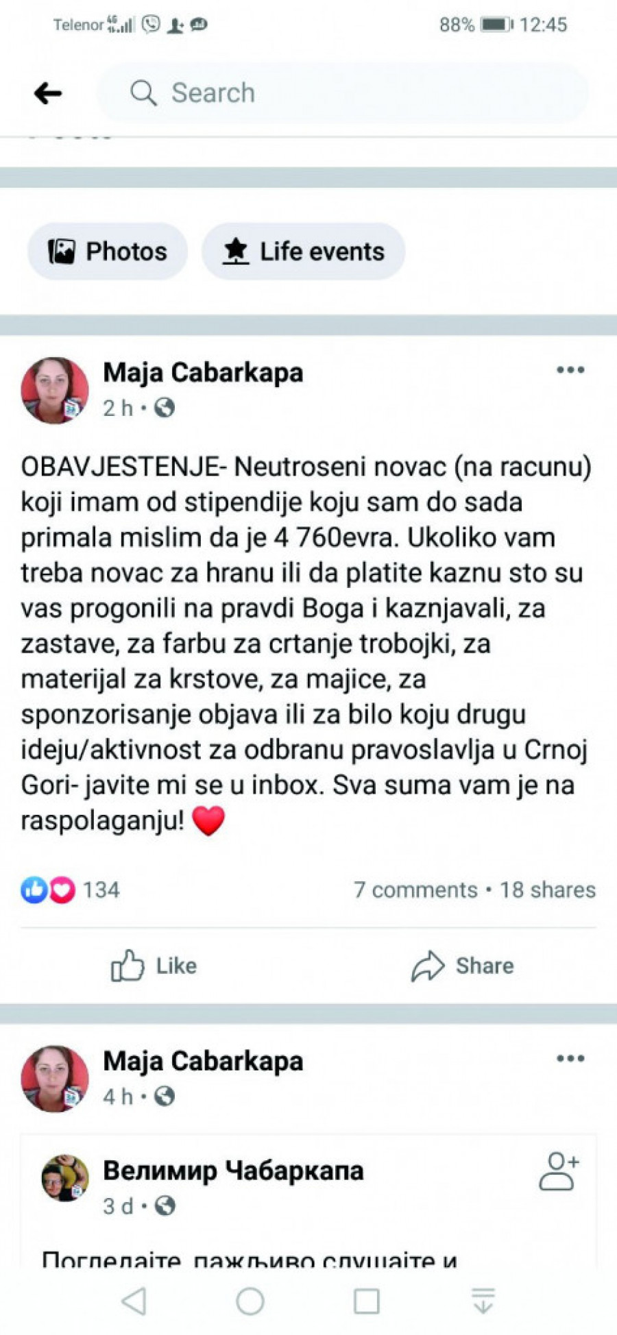 Preostali novac za zastave, krstove, farbu...Koliko je Maja posvećena odbrani srpskih svetinja, govori i njena objava na Fejsbuku, gde preostali novac od prethodne stipendije 4.760 evra nudi borcima za opstanak pravoslavlja. - Ukoliko vam treba novac za hranu ili da platite kaznu što su vas progonili na pravdi boga i kažnjavali, za zastavu, farbu za crtanje trobojki, materijal za krstove, majice i bilo koju objavu, sva suma vam je na raspolaganju - napisala je Čabarkapa. |