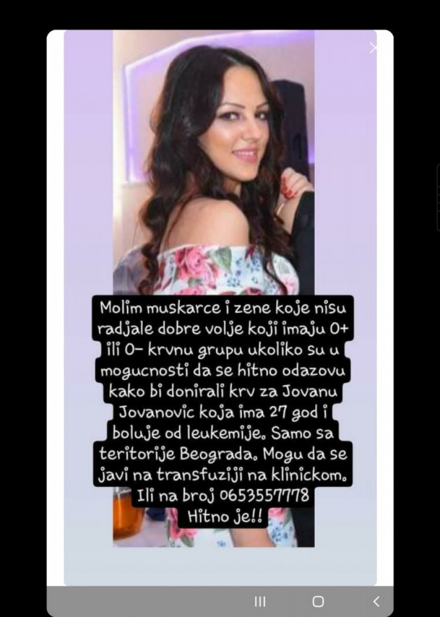 - Molim muškarce i žene koje nisu rađele, dobre volje, koji imaju O+ ili O- krvnu grupu ukoliko su u mogućnosti da se hitno odazovu kako bi donirali krv za Jovanu Jovanović koja ima 27 godina i boluje od leukemije. Samo sa teritorije Beograda. Mogu da se javi na transfuziji na kliničkom. Ili na broj 0653557778. Hitno je!!! - glasi poziv svim humanim ljudima koji žele da pomognu.