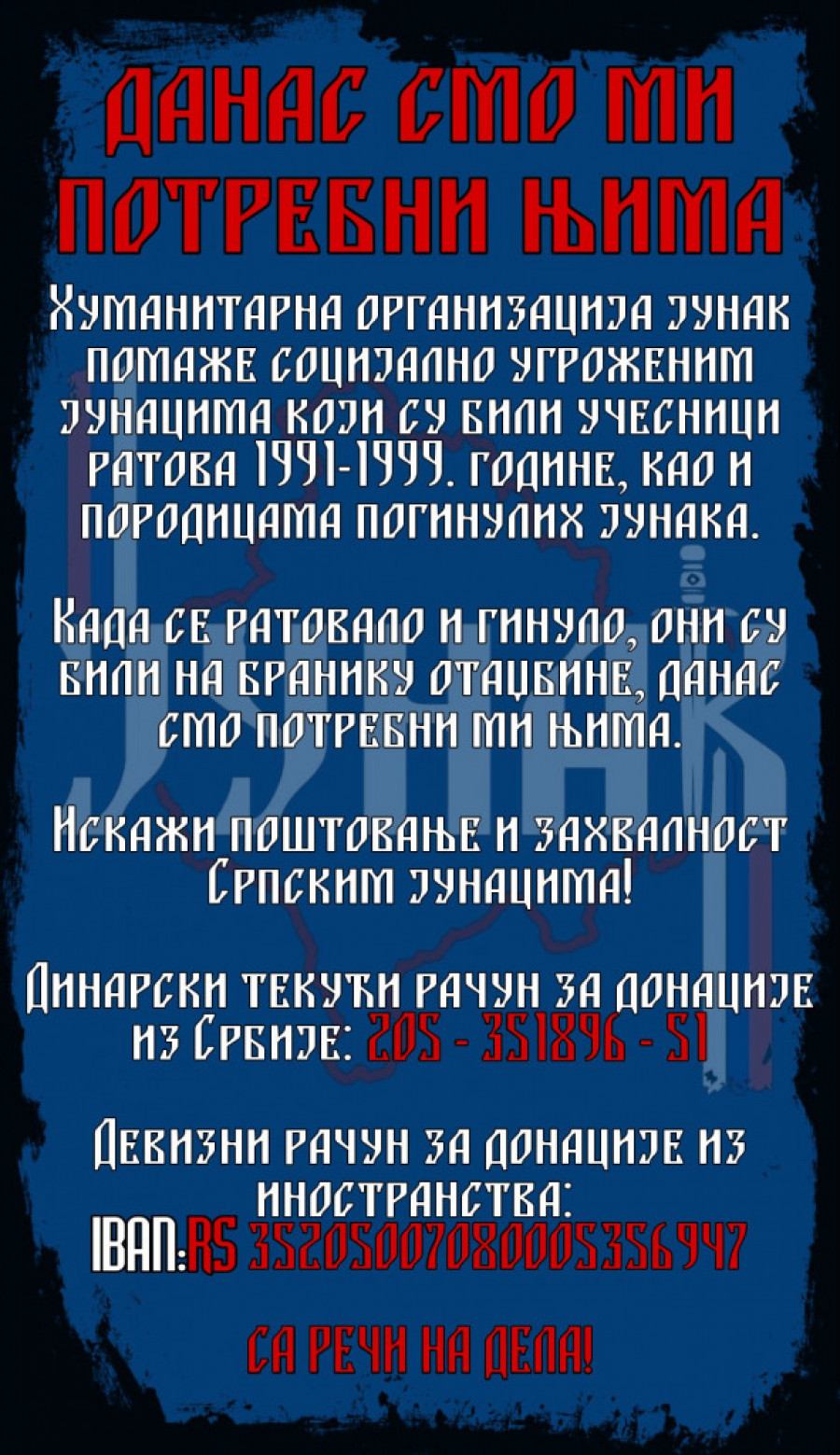 U našoj priči, podržao nas je Veljko Ražnatović, iskreni rodoljub, koji je patriotizam nasledio od svog oca,ratnog veterana i Srpskog junaka. Sa ponosom mogu da kažem da je Veljko član naše organizacije, i da će svojim imenom i talentom još mnogo toga doprineti JUNAKu i ratnim veteranima. 4. septembra u što većem broju dolazimo da ga podržimo na njegovom meču, koji je jedan od puteva koji vode do titule Evropskog šampiona.