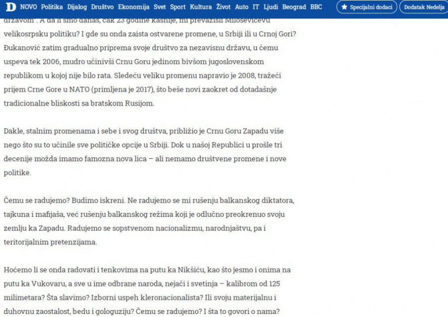 Hoćemo li se onda radovati i tenkovima na putu ka Nikšiću, kao što jesmo i onima na putu ka Vukovaru, a sve u ime odbrane naroda, nejači i svetinja – kalibrom od 125 milimetara? Šta slavimo? Izborni uspeh kleronacionalista? Ili svoju materijalnu i duhovnu zaostalost, bedu i gologuziju? Čemu se radujemo? I šta to govori o nama? -